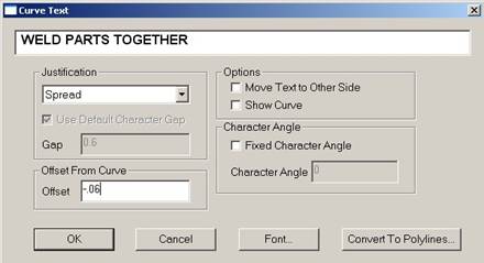 In the above example the polyline was selected and the font followed the curve. However the font is just above the line. In the following example the font was lowered so that the bottoms of the individual letters were just below the curve. With the letters touching a closed polygon it is a simple step to Weld the letters so that there is a continuous line running around the part.
